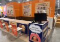 フードテックでの施工事例です。商品のイメージを壁面に出力で装飾しました。モニター設置用の造作台にはコンセント用の穴を開け、配線がすっきりするよう配慮しました。またコーポレートカラーで全体をまとめ、ビジュアルの映えるブースとなりました。