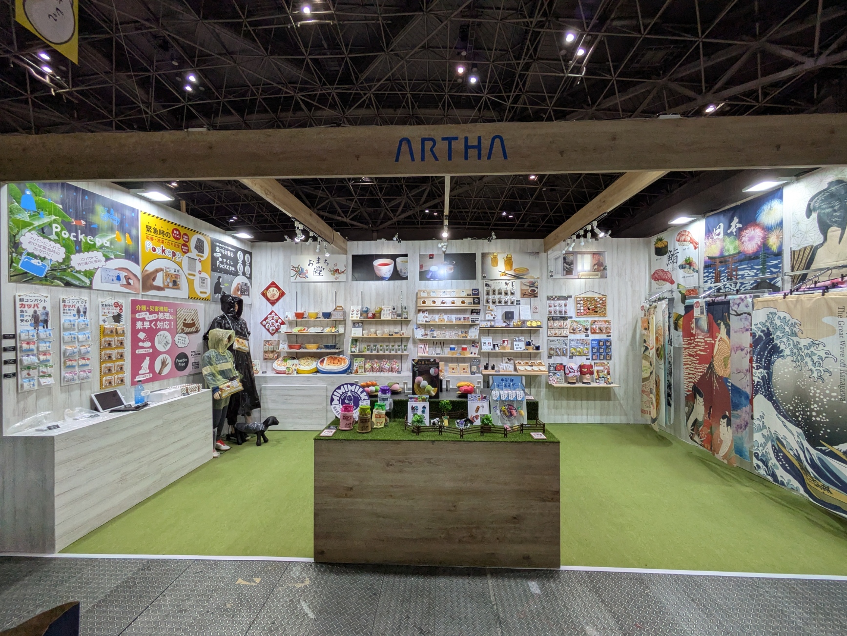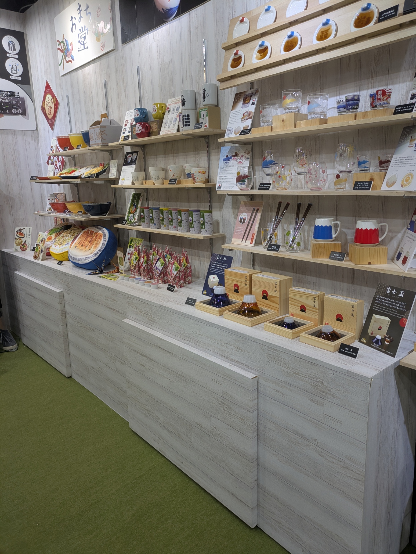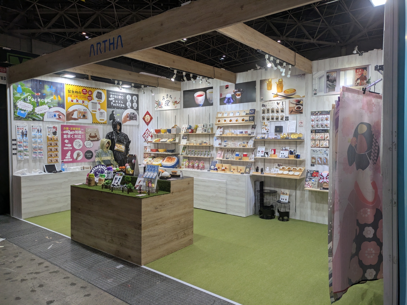 2小間のコの字ブース。商材に合わせて展示台の天板を人工芝で装飾し、通路を歩くお客様のアイキャッチに。製作した展示台の中はすべてストックとしてご利用いただけるようにご用意。展示会の運営もしやすいようにご提案させていただきました。壁面には見せる展示と掛ける展示を併用することで、展示する商品のSKUを増やしつつ見やすさも考慮。各パネルの貼り付けも弊社にて行いました。