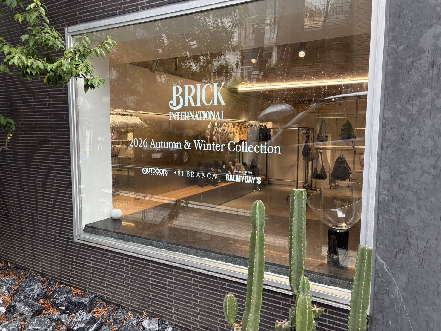 ホワイトカッティングシートによるブランドロゴ・シーズン告知の貼付をしました。視認性の高い太めのフォントを採用し、外光に負けないクリアな発色を実現。背景のショールーム内ディスプレイと調和するよう、配置のバランスをミリ単位で調整しています。
