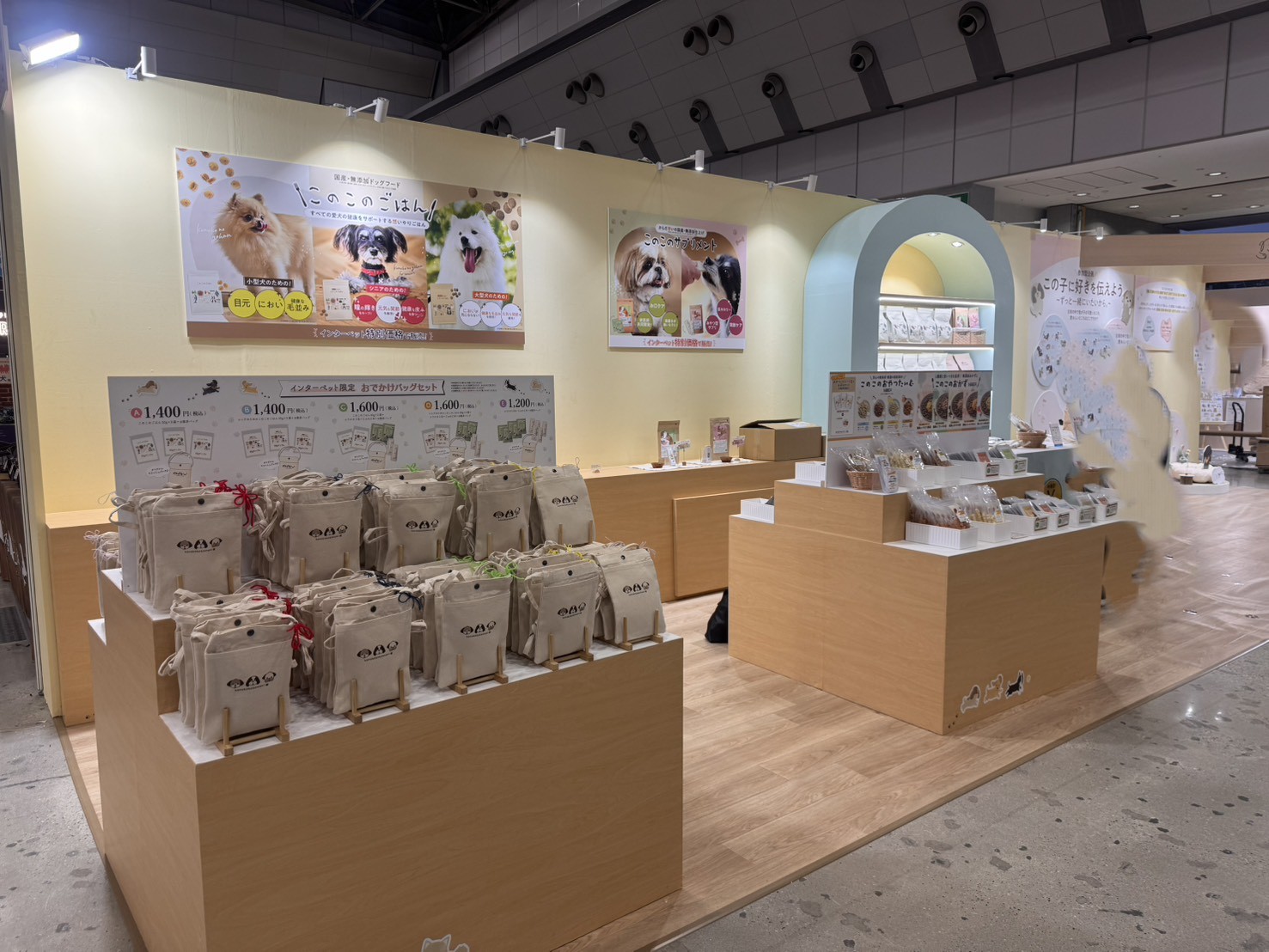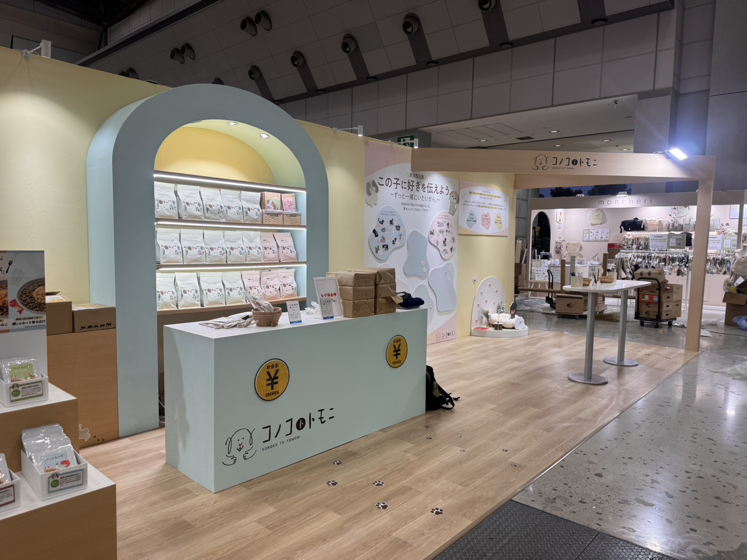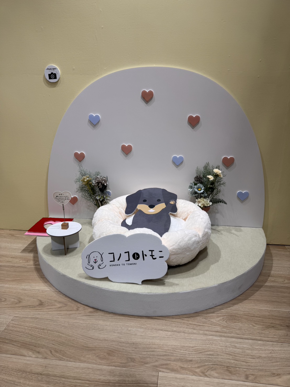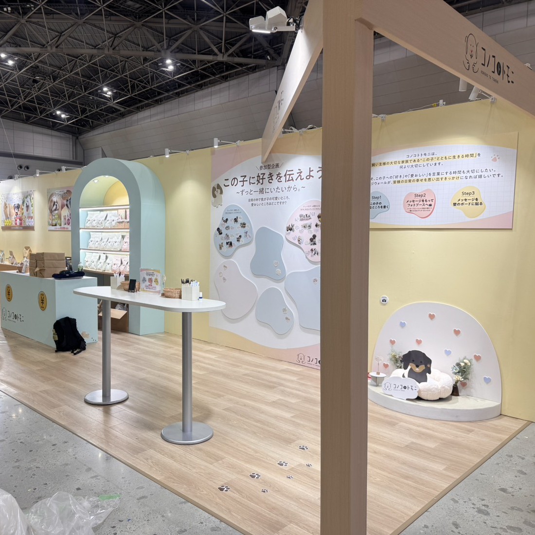 ミントグリーンを基調に、アーチ型の什器や木目調の床で「安心・安全・優しさ」が伝わる空間を表現。多くの愛犬家の方々が足を止め、メッセージを寄せる温かいブースとなりました。